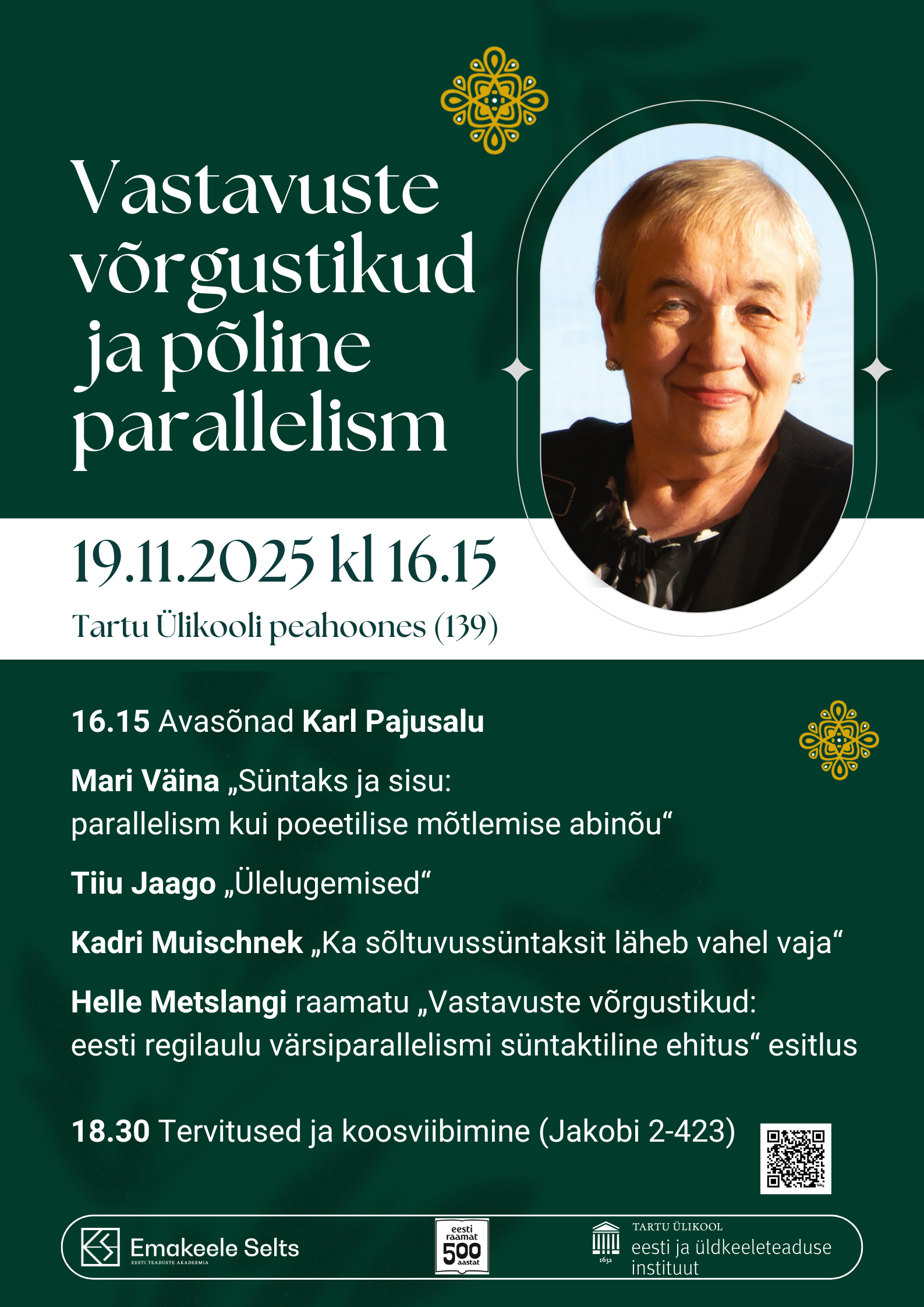 19. novembril 2025 algusega kell 16.15 toimub Tartu Ülikooli peahoones J. V. Veski auditooriumis (139) Helle Metslangi raamatu „Vastavuste võrgustikud: eesti regilaulu värsiparallelismi süntaktiline ehitus“ (Emakeele Seltsi toimetised nr 85) ilmumist ja autori 75. sünnipäeva tähistav kõnekoosolek.